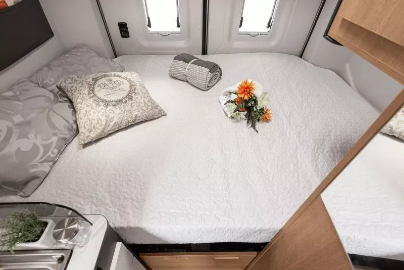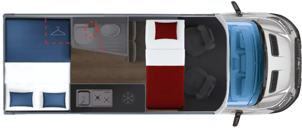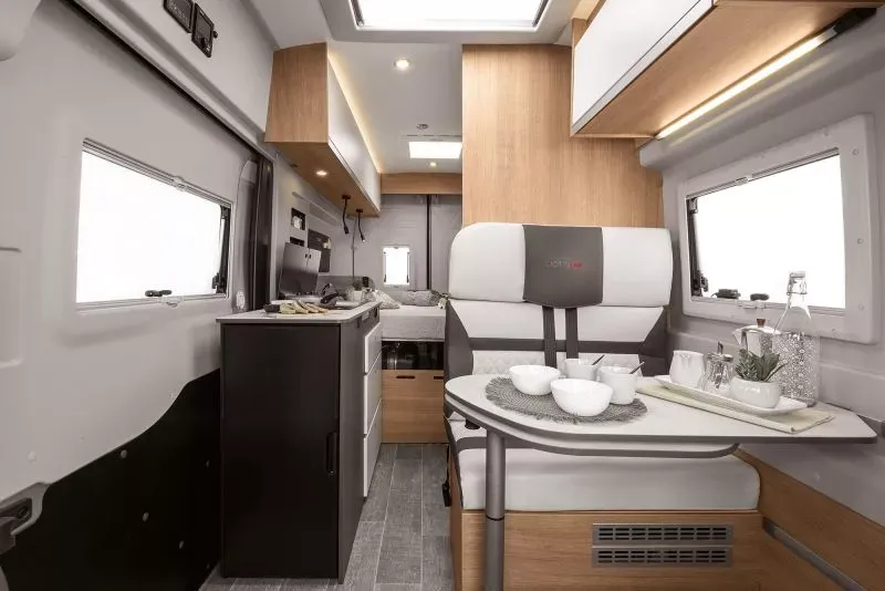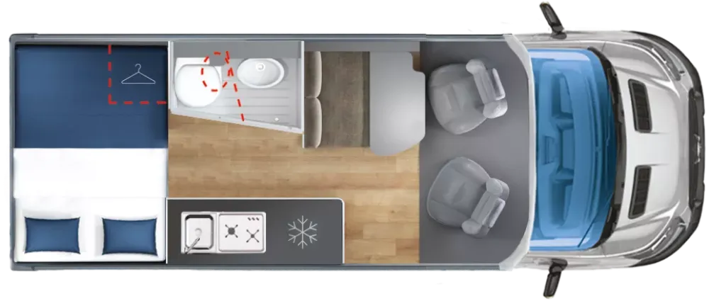 La GiottiVan 60FT es una furgoneta de 5,99 metros con cama francesa , baño compacto y una distribución interior racional y cómoda. Diseñada para dos personas, ofrece espacios bien iluminados, acabados refinados y una excelente maniobrabilidad en carretera. La combinación perfecta entre una autocaravana y un coche de viaje, para salir en cualquier momento.