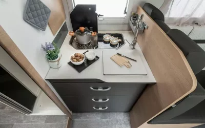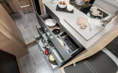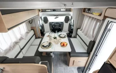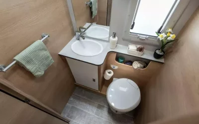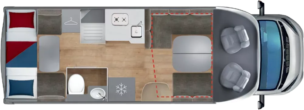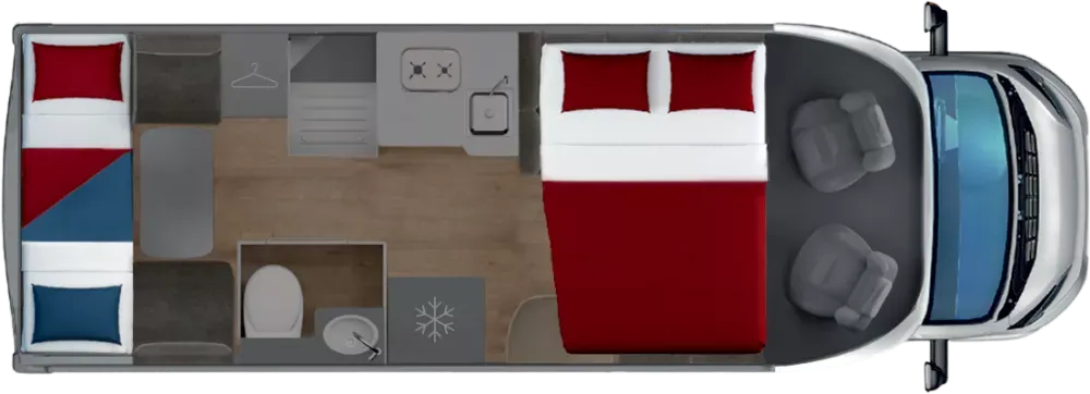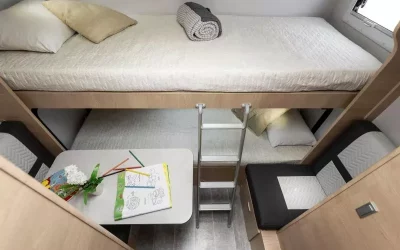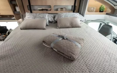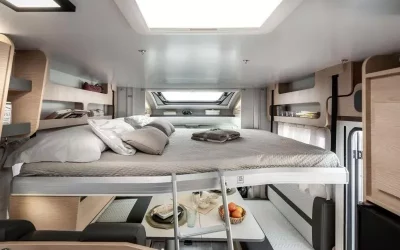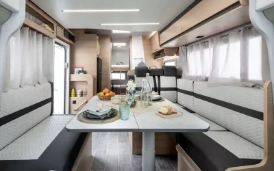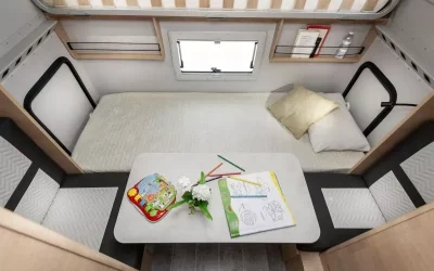 El Siena 396 es la autocaravana perfilada ideal para familias que buscan espacio, comodidad y funcionalidad. Con una longitud de 7,40 metros, ofrece una distribución inteligente con camas gemelas traseras unificables, baño con ducha separada y una amplia zona de estar. El salón cara a cara acomoda hasta cinco personas y se convierte fácilmente en cama, con la opción de una cama basculante eléctrica adicional. El gran garaje trasero, accesible desde ambos lados, permite llevar todo lo necesario para largos viajes.
