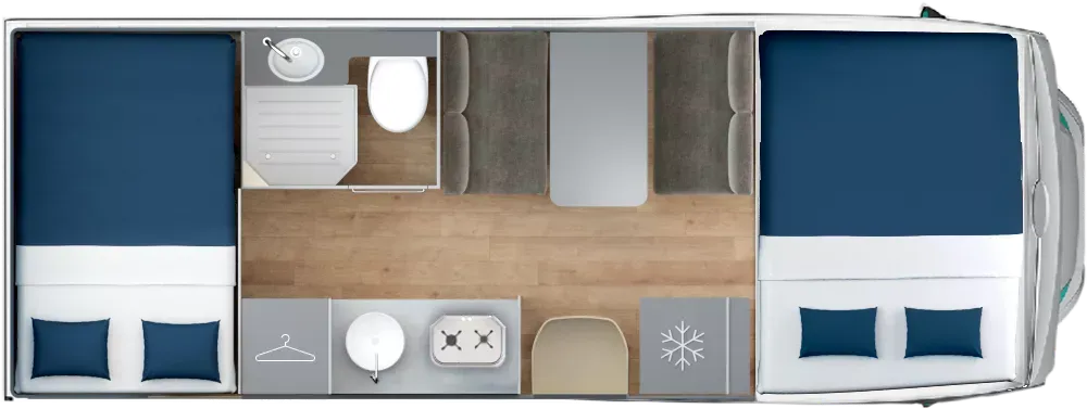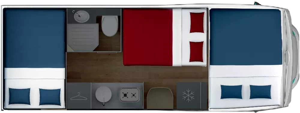 El Siena 440 es un habitáculo amplio y bien estructurado, diseñado para familias numerosas o grupos de amigos. Con una longitud de 6,99 metros , cuenta con una cama doble en el habitáculo, cama transversal doble y un comedor convertible , con capacidad para seis cómodas camas. Los espacios interiores son prácticos y están bien distribuidos, con una cocina en forma de L, un baño funcional y amplios compartimentos de almacenamiento. Ideal para viajes largos y aventuras compartidas, está disponible con mecánica Citroën o Peugeot y Fiat , combinando robustez, habitabilidad y versatilidad en una única solución.