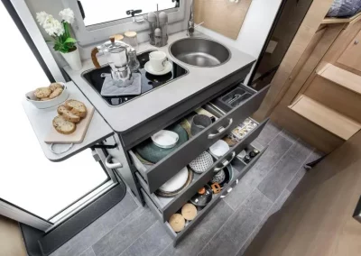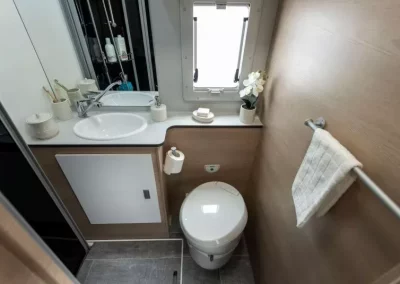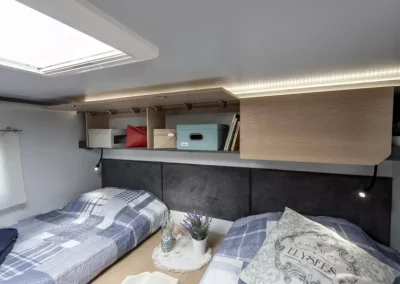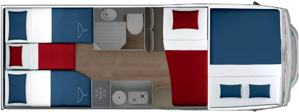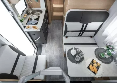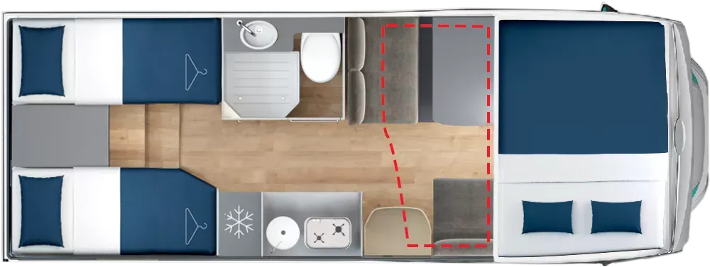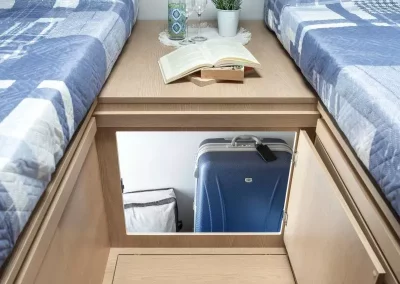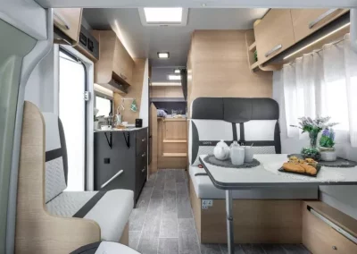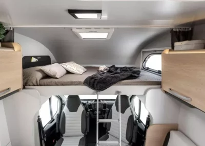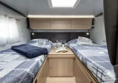 La Siena 485 es la autocaravana capuchina ideal para quienes desean viajar en familia con comodidad y versatilidad. Con 6,99 metros de longitud, ofrece distribución de camas gemelas en la parte trasera , una amplia cama doble de 142 x 212 cm en la capuchina y capacidad homologada para hasta seis personas. Las camas traseras miden 78 x 188 cm y 81 x 192 cm, perfectas para garantizar un descanso confortable incluso en viajes largos. La autocaravana incluye anclajes ISOFIX de serie y un amplio garaje trasero accesible por ambos lados.